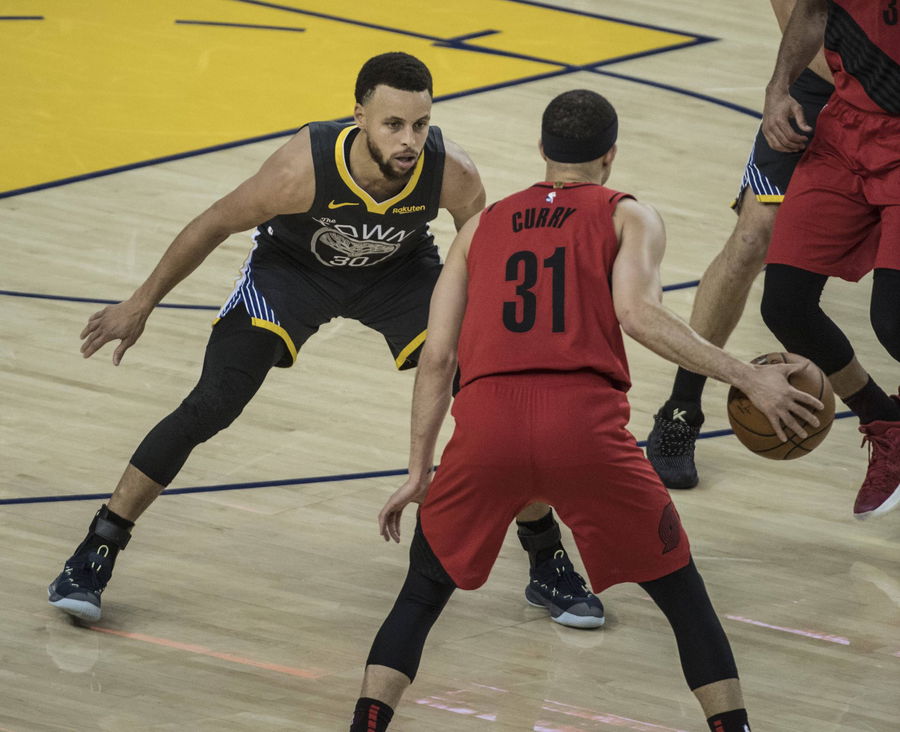 Portland Trail Blazers guard Seth Curry (31) is guarded by brother Golden State Warriors guard Stephen Curry (30) in game two of the Western Conference Finals in Oakland, California on May 16, 2019. PUBLICATIONxINxGERxSUIxAUTxHUNxONLY SXP2019051619 TERRYxSCHMITT