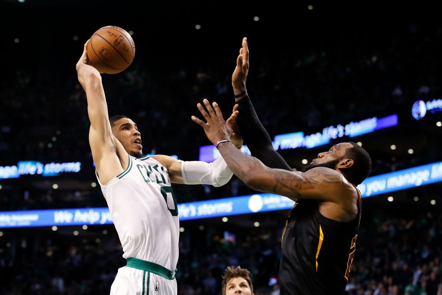 May 27, 2018; Boston, MA, USA; Cleveland Cavaliers forward LeBron James (23) with Boston Celtics forward Jayson Tatum (0) after the game against the Cleveland Cavaliers in game seven of the Eastern conference finals of the 2018 NBA Playoffs at TD Garden. Cleveland defeated the Celtics 87-79. Mandatory Credit: David Butler II-USA TODAY Sports
