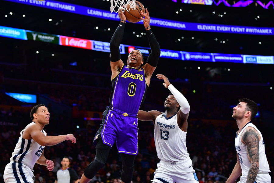 January 20, 2023; Los Angeles, California, USA; Los Angeles Lakers guard Russell Westbrook (0) moves to the basket against Memphis Grizzlies forward Jaren Jackson Jr. (13) guard Desmond Bane (22) and guard John Kochar (46) during the first half at Crypto.com Arena. Mandatory Credit: Gary A. Vasquez-USA TODAY Sports