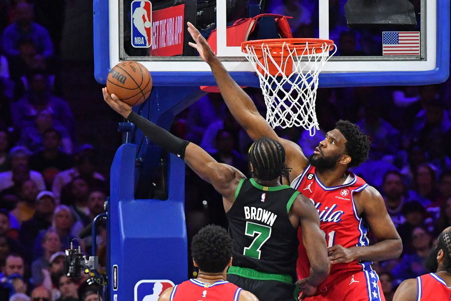 May 5, 2023; Philadelphia, Pennsylvania, USA; Philadelphia 76ers center Joel Embiid (21) blocks shot attempt by Boston Celtics guard Jaylen Brown (7) during the first quarter of game three of the 2023 NBA playoff at Wells Fargo Center. Mandatory Credit: Eric Hartline-USA TODAY Sports