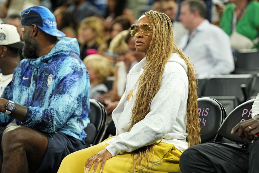 Aug 7, 2024; Paris, France; Savannah James, wife of Lebron James, sits court side before the game between the United States and Nigeria in the women’s basketball quarterfinals during the Paris 2024 Olympic Summer Games at Accor Arena. Mandatory Credit: Kyle Terada-USA TODAY Sports