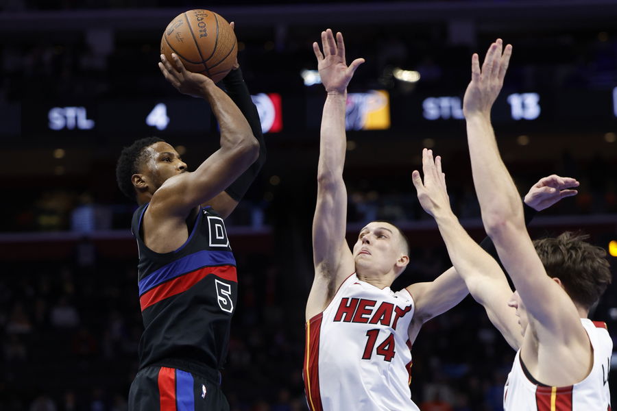 Nov 12, 2024; Detroit, Michigan, USA; Detroit Pistons guard Malik Beasley (5) shoots on Miami Heat guard Tyler Herro (14) in the second half at Little Caesars Arena. Mandatory Credit: Rick Osentoski-Imagn Images
