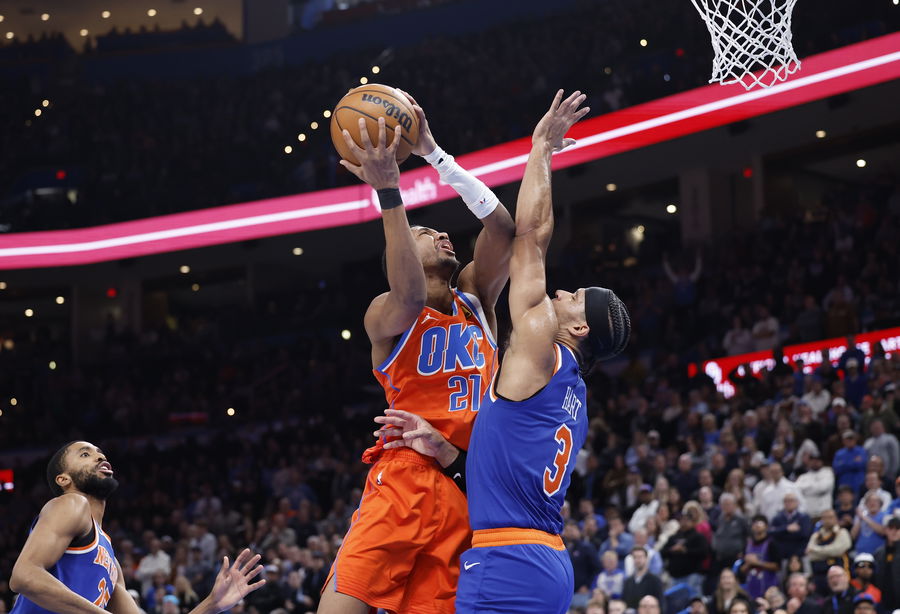 Jan 3, 2025; Oklahoma City, Oklahoma, USA; Oklahoma City Thunder guard Aaron Wiggins (21) goes up for a basket against New York Knicks guard Josh Hart (3) during the second half at Paycom Center. Mandatory Credit: Alonzo Adams-Imagn Images
