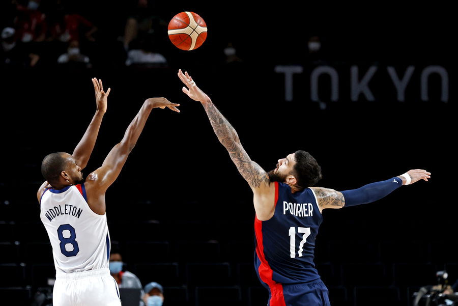 Aug 7, 2021; Saitama, Japan; United States small forward Khris Middleton (8) shoots the ball against France centre Vincent Poirier (17) in the men’s basketball gold medal game during the Tokyo 2020 Olympic Summer Games at Saitama Super Arena. Mandatory Credit: Geoff Burke-USA TODAY Sports