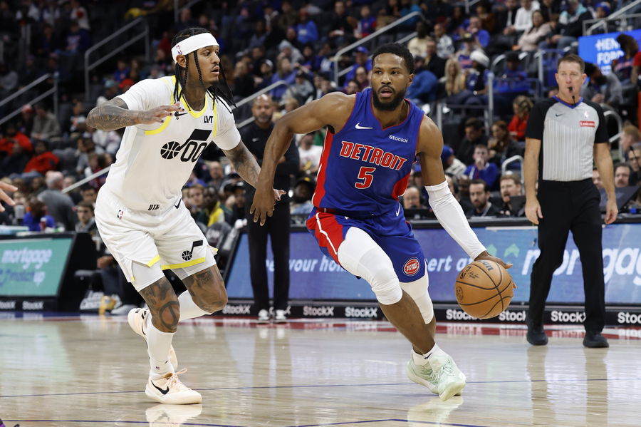 Dec 19, 2024; Detroit, Michigan, USA; Detroit Pistons guard Malik Beasley (5) dribbles on Utah Jazz guard Jordan Clarkson (00) in the first half at Little Caesars Arena. Mandatory Credit: Rick Osentoski-Imagn Images