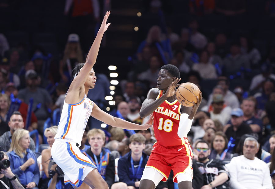 Oct 17, 2024; Oklahoma City, Oklahoma, USA; Oklahoma City Thunder forward Ousmane Dieng (13) defends a pass by Atlanta Hawks forward Mouhamed Gueye (18) during the second half at Paycom Center. Mandatory Credit: Alonzo Adams-Imagn Images