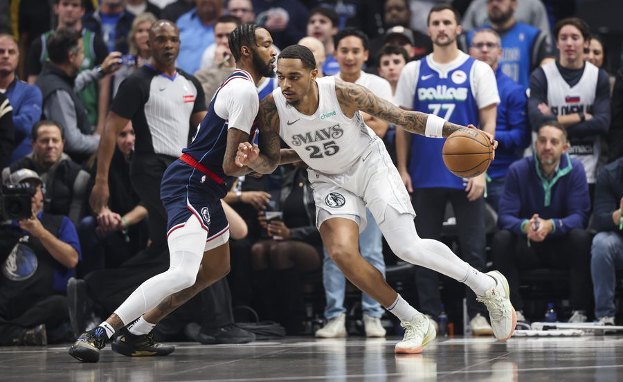 Dec 19, 2024; Dallas, Texas, USA; Dallas Mavericks forward P.J. Washington (25) dribbles as LA Clippers forward Derrick Jones Jr. (55) defends during the first quarter at American Airlines Center. Mandatory Credit: Kevin Jairaj-Imagn Images