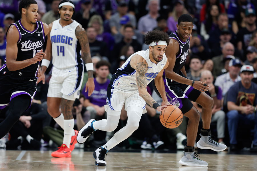 Jan 3, 2024; Sacramento, California, USA; Orlando Magic guard Trevelin Queen (12) steals the ball from Sacramento Kings guard De’Aaron Fox (5) during the first quarter at Golden 1 Center. Mandatory Credit: Sergio Estrada-USA TODAY Sports