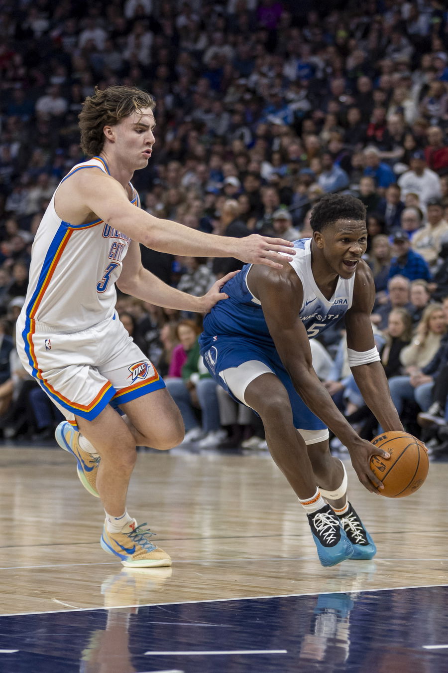 Jan 20, 2024; Minneapolis, Minnesota, USA; Minnesota Timberwolves guard Anthony Edwards (5) drives to the basket past Oklahoma City Thunder guard Josh Giddey (3) in the second half at Target Center. Mandatory Credit: Jesse Johnson-USA TODAY Sports