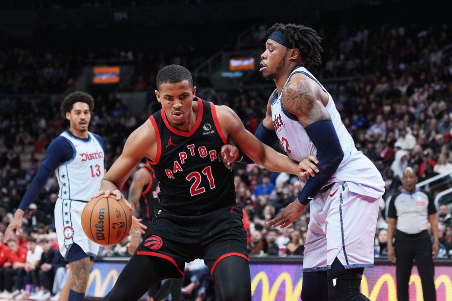 Mar 8, 2025; Toronto, Ontario, CAN; Toronto Raptors center Orlando Robinson (21) controls the ball as Washington Wizards forward Richaun Holmes (22) tries to defend during the fourth quarter at Scotiabank Arena. Mandatory Credit: Nick Turchiaro-Imagn Images