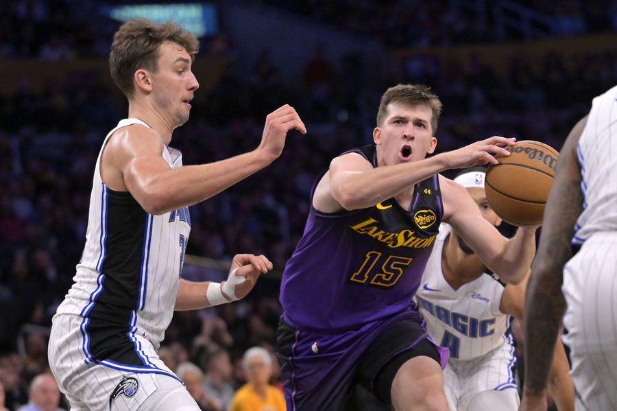 Nov 21, 2024; Los Angeles, California, USA; Los Angeles Lakers guard Austin Reaves (15) is defended by Orlando Magic forward Franz Wagner (22) in the second half at Crypto.com Arena. Mandatory Credit: Jayne Kamin-Oncea-Imagn Images