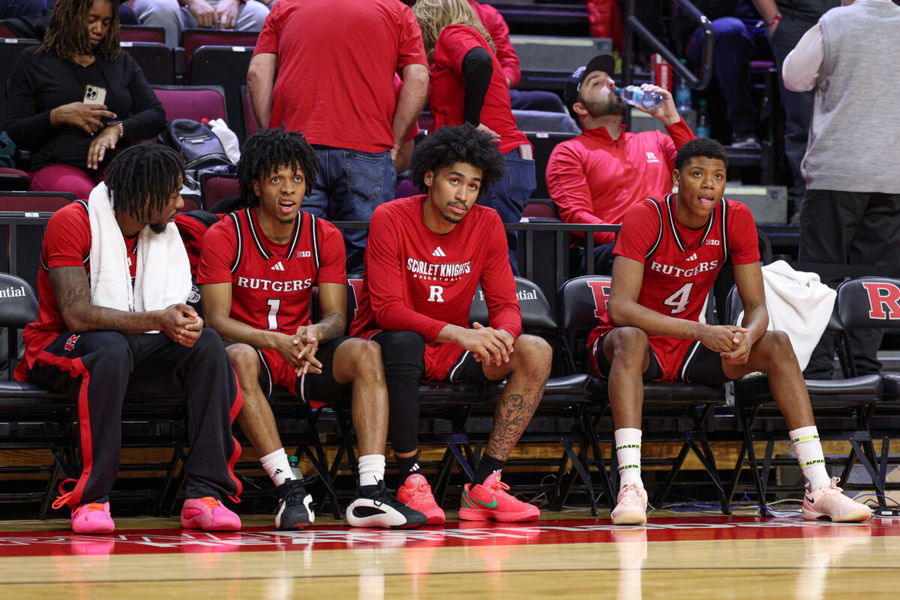 Jan 9, 2025; Piscataway, New Jersey, USA; Rutgers Scarlet Knights guard Ace Bailey (4) and guard Dylan Harper (2) and guard Jamichael Davis (1) sit on the bench during halftime against the Purdue Boilermakers at Jersey Mike’s Arena. Mandatory Credit: Vincent Carchietta-Imagn Images