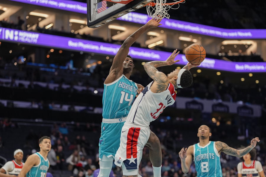 Feb 3, 2025; Charlotte, North Carolina, USA; Washington Wizards forward Kyle Kuzma (33) up for a shot defended by Charlotte Hornets forward Moussa Diabate (14) during the second half at Spectrum Center. Mandatory Credit: Jim Dedmon-Imagn Images