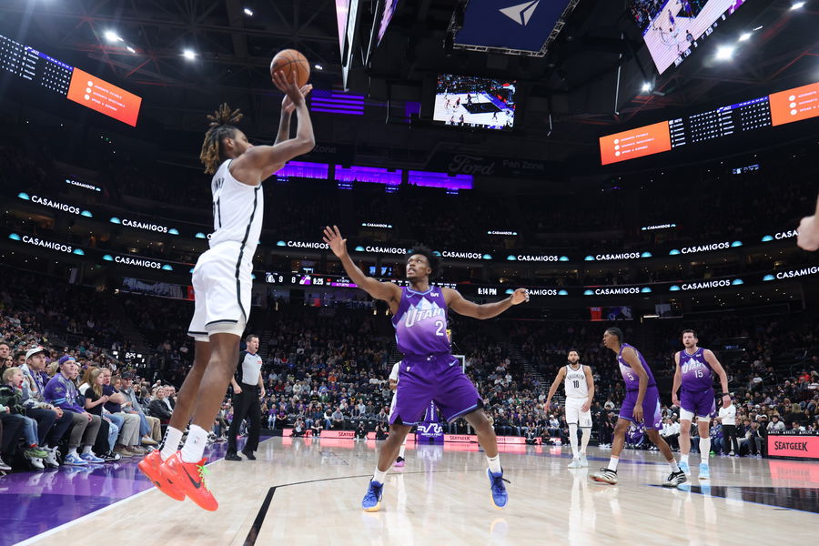 Jan 12, 2025; Salt Lake City, Utah, USA; Brooklyn Nets forward Noah Clowney (21) shoots a three point shot over Utah Jazz guard Collin Sexton (2) during the first quarter at Delta Center. Mandatory Credit: Rob Gray-Imagn Images