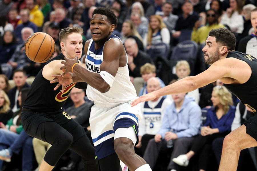 Jan 18, 2025; Minneapolis, Minnesota, USA; Minnesota Timberwolves guard Anthony Edwards (5) works around Cleveland Cavaliers guard Sam Merrill (5) during the second quarter at Target Center. Mandatory Credit: Matt Krohn-Imagn Images