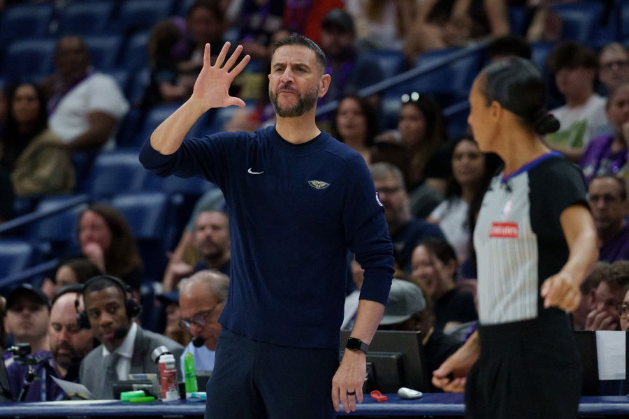 Mar 30, 2025; New Orleans, Louisiana, USA; New Orleans Pelicans associate head coach James Borrego reacts against the Charlotte Hornets during the first half at Smoothie King Center. Mandatory Credit: Matthew Hinton-Imagn Images