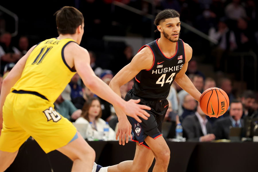 Mar 10, 2023; New York, NY, USA; Connecticut Huskies guard Andre Jackson Jr. (44) controls the ball against Marquette Golden Eagles guard Tyler Kolek (11) during the first half at Madison Square Garden. Mandatory Credit: Brad Penner-USA TODAY Sports
