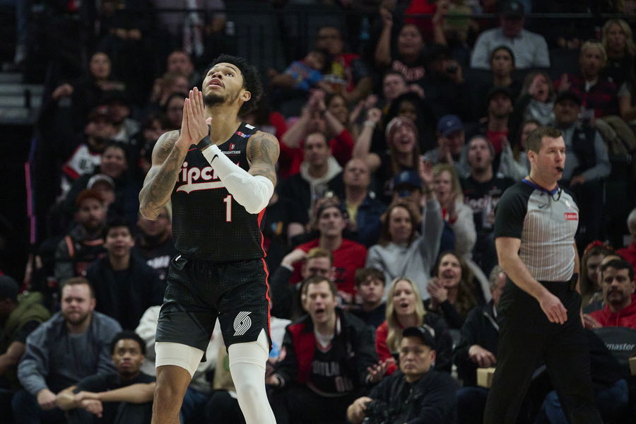 Jan 11, 2025; Portland, Oregon, USA; Portland Trail Blazers guard Anfernee Simons (1) reacts after being fouled and scoring a basket during the second half against the Miami Heat at Moda Center. Mandatory Credit: Troy Wayrynen-Imagn Images