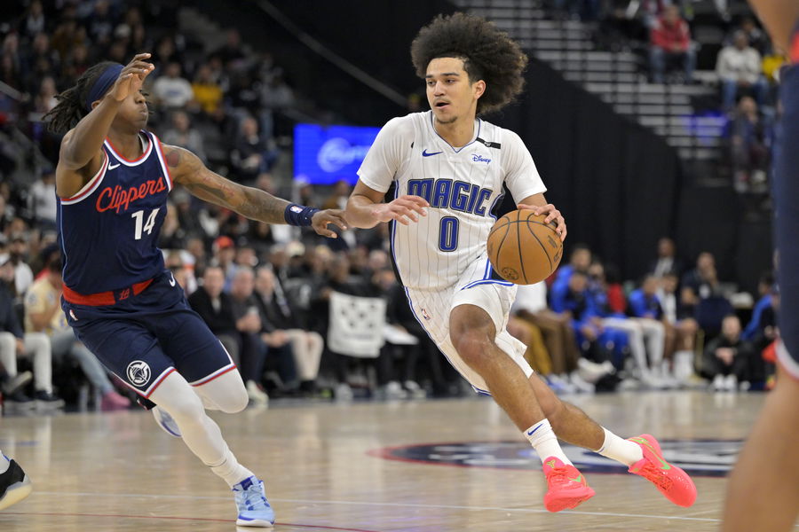 Nov 20, 2024; Inglewood, California, USA; Los Angeles Clippers guard Terance Mann (14) defends Orlando Magic guard Anthony Black (0) in the second half at Intuit Dome. Mandatory Credit: Jayne Kamin-Oncea-Imagn Images