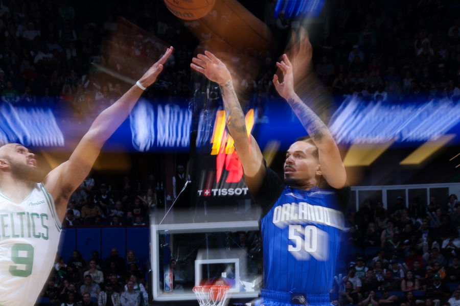 Dec 23, 2024; Orlando, Florida, USA; Orlando Magic guard Cole Anthony (50) shoots the ball against the Boston Celtics in the third quarter at Kia Center. Mandatory Credit: Nathan Ray Seebeck-Imagn Images