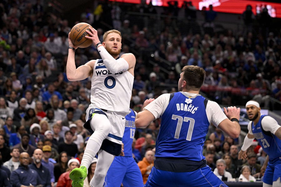 Dec 25, 2024; Dallas, Texas, USA; Minnesota Timberwolves guard Donte DiVincenzo (0) and Dallas Mavericks guard Luka Doncic (77) in action during the game between the Dallas Mavericks and the Minnesota Timberwolves at the American Airlines Center. Mandatory Credit: Jerome Miron-Imagn Images