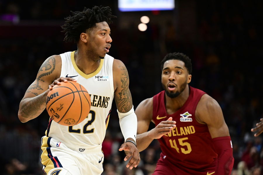 Nov 20, 2024; Cleveland, Ohio, USA; New Orleans Pelicans guard Elfrid Payton (22) brings the ball up court during the second half against the Cleveland Cavaliers at Rocket Mortgage FieldHouse. Mandatory Credit: Ken Blaze-Imagn Images