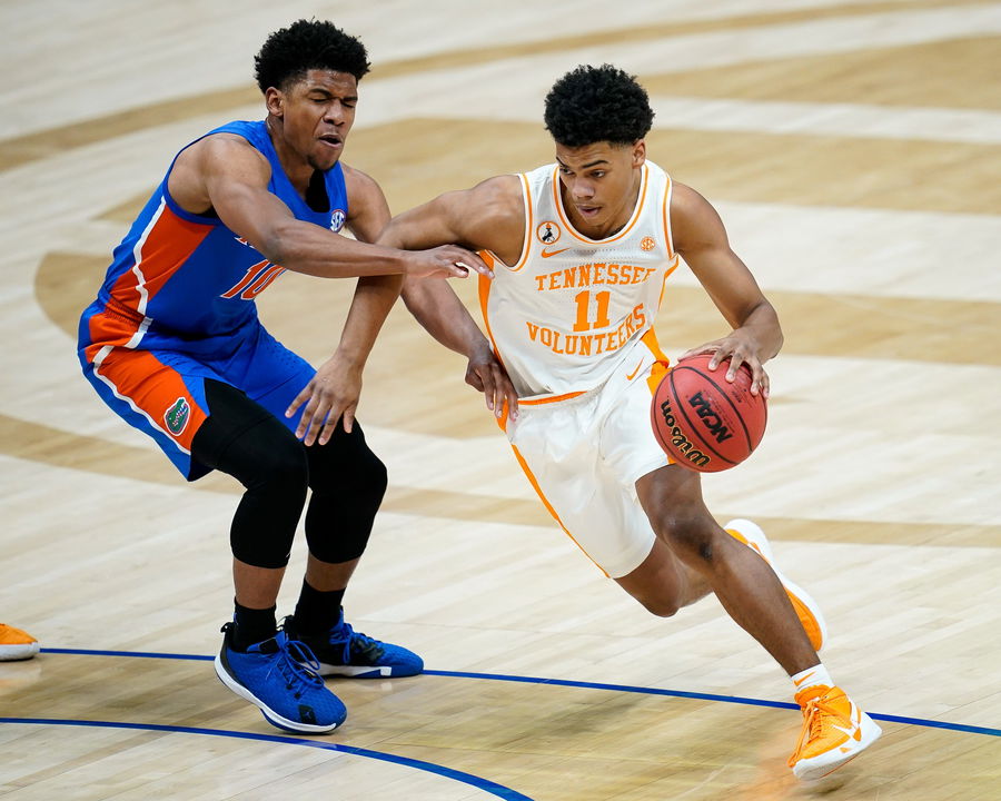 Tennessee guard Jaden Springer (11) moves the ball past Florida guard Noah Locke. (10) During the first half of the SEC Men’s Basketball Tournament game at Bridgestone Arena in Nashville, Tenn., Friday, March 12, 2021. Ut Fla Sec 031221 An 009