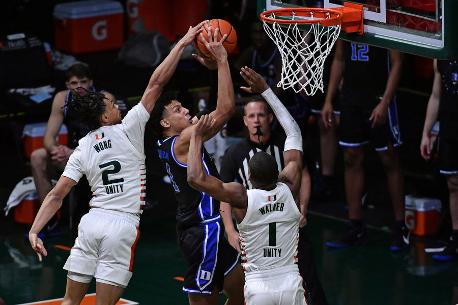 Feb 1, 2021; Coral Gables, Florida, USA; Miami Hurricanes guard Isaiah Wong (2) blocks the shot of Duke Blue Devils forward Jalen Johnson (1) during the second half at Watsco Center. Mandatory Credit: Jasen Vinlove-USA TODAY Sports