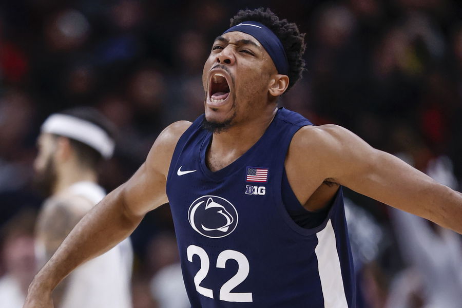 Mar 10, 2023; Chicago, IL, USA; Penn State Nittany Lions guard Jalen Pickett (22) celebrates after scoring against the Northwestern Wildcats during the overtime at United Center. Mandatory Credit: Kamil Krzaczynski-USA TODAY Sports