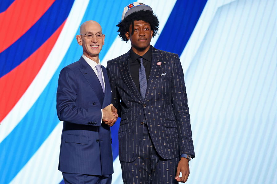 Jun 23, 2022; Brooklyn, NY, USA; Jalen Williams (Santa Clara) shakes hands with NBA commissioner Adam Silver after being selected as the number twelve overall pick by the Oklahoma City Thunder in the first round of the 2022 NBA Draft at Barclays Center. Mandatory Credit: Brad Penner-USA TODAY Sports