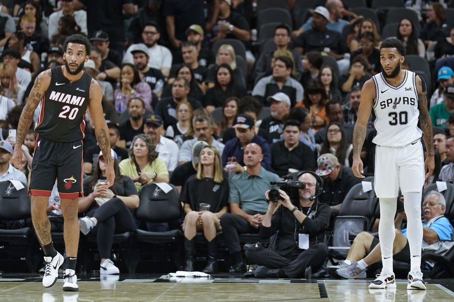 Oct 13, 2023; San Antonio, Texas, USA; Brothers Miami Heat forward Justin Champagnie (20) and San Antonio Spurs forward Julian Champagnie (30) during the second half at Frost Bank Center. Mandatory Credit: Scott Wachter-USA TODAY Sports