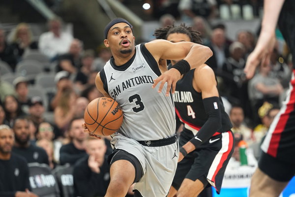 Apr 8, 2026; San Antonio, Texas, USA; San Antonio Spurs forward Keldon Johnson (3) drives to the basket during the first half against the Portland Trail Blazers at Frost Bank Center. Mandatory Credit: Scott Wachter-Imagn Images