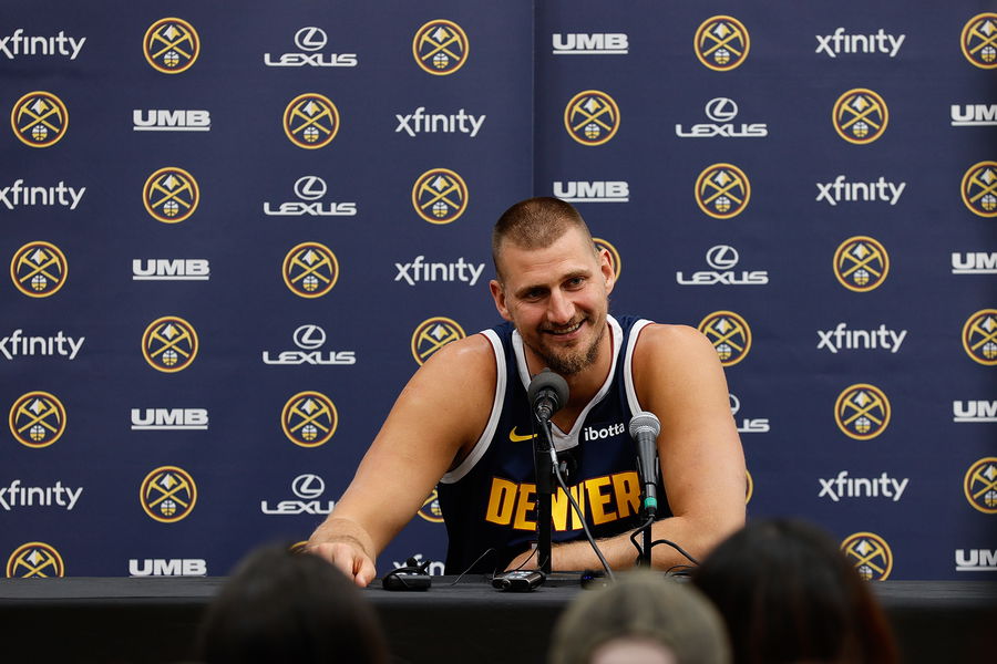 Sep 29, 2025; Denver, CO, USA; Denver Nuggets player Nikola Jokic (15) takes questions during media day at Ball Arena. Mandatory Credit: Isaiah J. Downing-Imagn Images