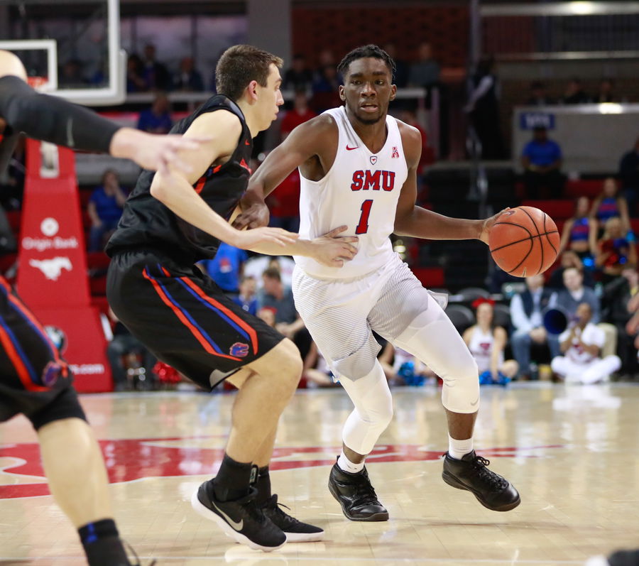 Dec 18, 2017; Dallas, TX, USA; SMU Mustangs guard Shake Milton (1) drives the ball around Boise State Broncos guard Justinian Jessup (3) during the second half at Moody Coliseum. Mandatory Credit: Jim Cowsert-USA TODAY Sports