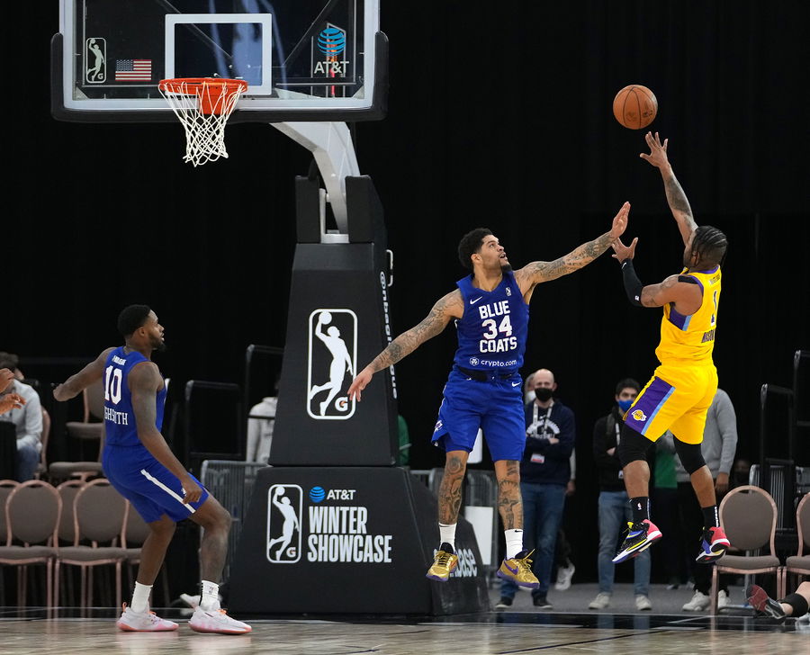 Dec 21, 2021; Las Vegas, NV, USA; South Bay Lakers guard Frank Mason (right) shoots the ball against Delaware Blue Coats guard Jarron Cumberland (34) during the second quarter at Mandalay Bay Convention Center. Mandatory Credit: Stephen R. Sylvanie-USA TODAY Sports