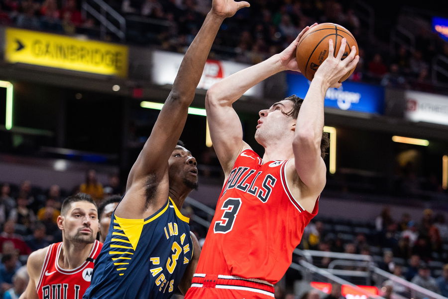 Jan 8, 2025; Indianapolis, Indiana, USA; Chicago Bulls guard Josh Giddey (3) shoots against Indiana Pacers center Thomas Bryant (3) in the first half at Gainbridge Fieldhouse. Mandatory Credit: Trevor Ruszkowski-Imagn Images