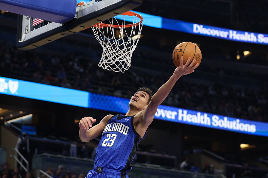 Dec 19, 2024; Orlando, Florida, USA; Orlando Magic forward Tristan da Silva (23) drives to the basket against the Oklahoma City Thunder in the first quarter at Kia Center. Mandatory Credit: Nathan Ray Seebeck-Imagn Images