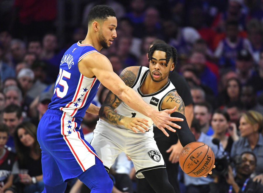 Apr 23, 2019; Philadelphia, PA, USA; Brooklyn Nets guard D’Angelo Russell (1) looks to pass while being defended by Philadelphia 76ers guard Ben Simmons (25) during the first quarter in game five of the first round of the 2019 NBA Playoffs at Wells Fargo Center. Mandatory Credit: Eric Hartline-USA TODAY Sports