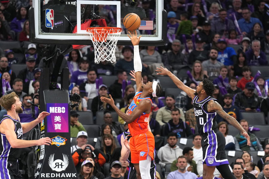 Dec 14, 2023; Sacramento, California, USA; Oklahoma City Thunder guard Shai Gilgeous-Alexander (center) shoots against Sacramento Kings guard Kevin Huerter (obscured) and guard Malik Monk (0) during the second quarter at Golden 1 Center. Mandatory Credit: Darren Yamashita-USA TODAY Sports