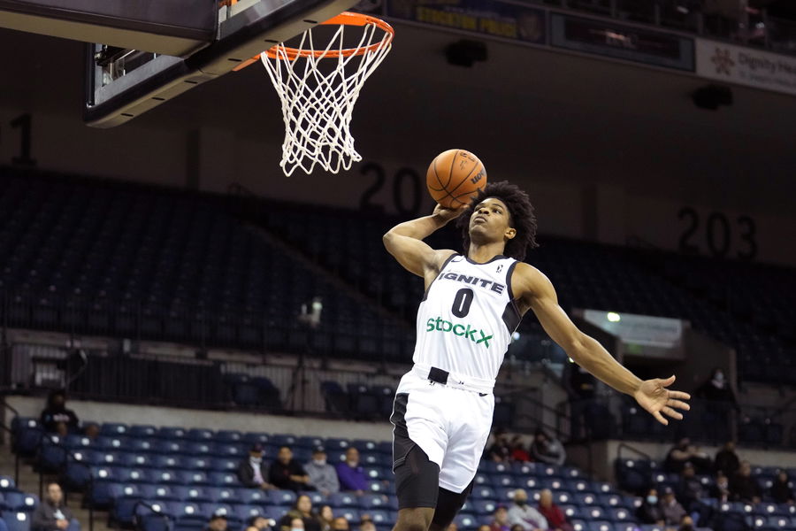 Nov 29, 2021; Stockton, CA, USA; G League Ignite guard Scoot Henderson (0) dunks during the second quarter against the Stockton Kings at Stockton Arena. Mandatory Credit: Darren Yamashita-USA TODAY Sports.