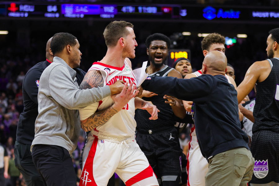 Jan 13, 2023; Sacramento, California, USA; Houston Rockets guard Garrison Mathews (25) and Sacramento Kings forward Chimezie Metu (7) confront each other during the fourth quarter at Golden 1 Center. Mandatory Credit: Sergio Estrada-USA TODAY Sports