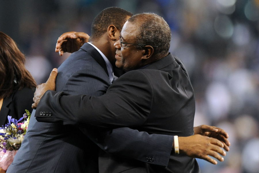 Aug 10, 2013; Seattle, WA, USA; Seattle Mariners former outfielder Ken Griffey Jr. hugs his father Ken Griffey Sr. during an induction ceremony into the Seattle Mariners hall of fame before the game between the Seattle Mariners and the Milwaukee Brewers at Safeco Field.. Mandatory Credit: Steve Dykes-USA TODAY Sports