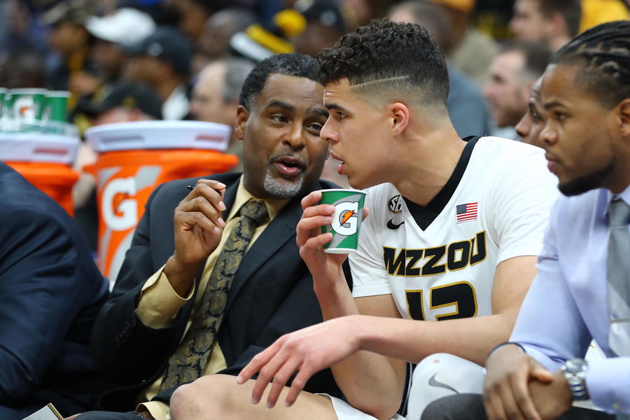 Mar 8, 2018; St. Louis, MO, USA; Missouri Tigers forward Michael Porter Jr. (13) speaks with his father Michael Porter Sr. during the first half of the second round of the SEC Conference Tournament against the Georgia Bulldogs at Scottrade Center. Mandatory Credit: Billy Hurst-USA TODAY Sports