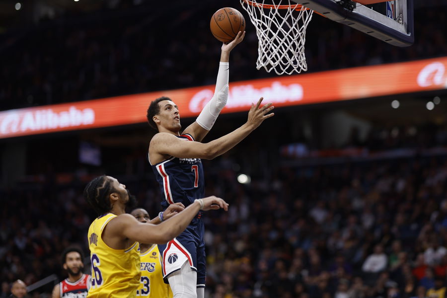 Apr 3, 2024; Washington, District of Columbia, USA; Washington Wizards forward Patrick Baldwin Jr. (7) shoots the ball as Los Angeles Lakers guard Spencer Dinwiddie (26) looks on in the second half at Capital One Arena. Mandatory Credit: Geoff Burke-USA TODAY Sports