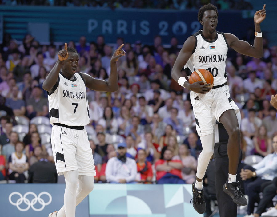 Paris 2024 Olympics – Basketball – Men’s Group Phase – Group C – South Sudan vs Puerto Rico – Lille, Pierre Mauroy Stadium, Villeneve-d’Ascq, France – July 28, 2024. Bul Kuol of South Sudan and Jt Thor of South Sudan react. REUTERS/Evelyn Hockstein