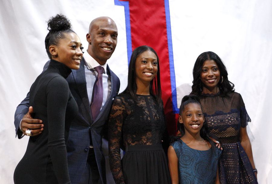 Feb 10, 2016; Auburn Hills, MI, USA; Chauncey Billups poses with his family during the halftime retirement ceremony in the game between the Detroit Pistons and the Denver Nuggets at The Palace of Auburn Hills. Mandatory Credit: Raj Mehta-USA TODAY Sports