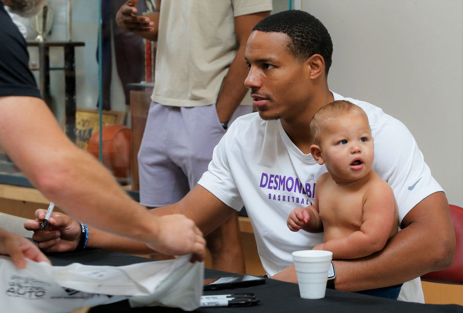 Desmond Bane holds his son, Armani, while signing an autograph during the third day of Bane’s second annual Basketball Skills Academy on July 19, 2023.