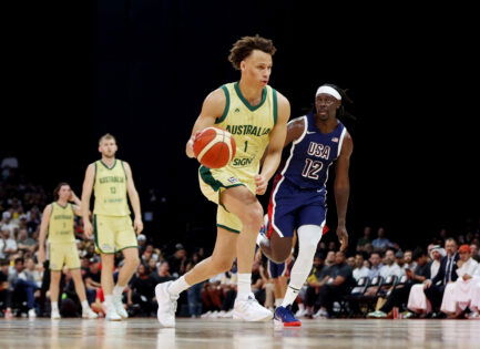 Basketball – Basketball Showcase Game – United States v Australia – Etihad Arena, Abu Dhabi, United Arab Emirates – July 15, 2024 Australia’s Dyson Daniels in action with Jrue Holiday of the U.S. REUTERS/Amr Alfiky