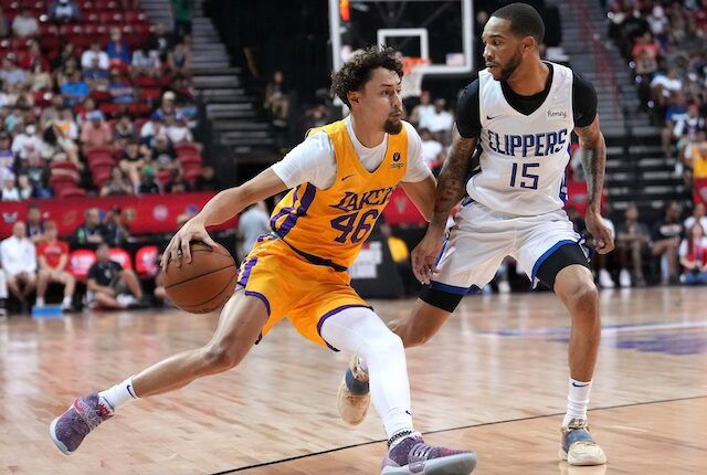 Jul 12, 2022; Las Vegas, NV, USA; Los Angeles Lakers guard Javante McCoy (46) dribbles against LA Clippers guard Xavier Moon (15) during an NBA Summer League game at Thomas & Mack Center. Mandatory Credit: Stephen R. Sylvanie-USA TODAY Sports