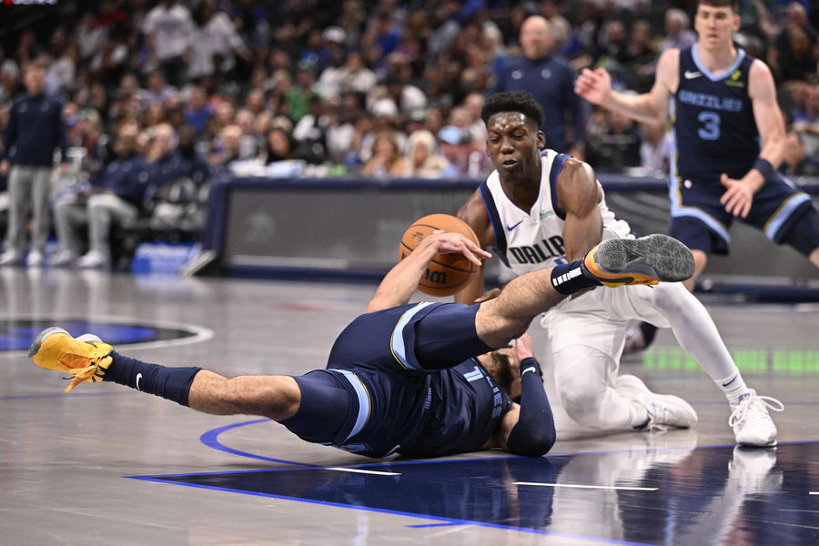 Oct 7, 2024; Dallas, Texas, USA; Memphis Grizzlies guard Scotty Pippen Jr. (1) and Dallas Mavericks guard Jazian Gortman (00) battle for control of the ball during the second half at the American Airlines Center. Mandatory Credit: Jerome Miron-Imagn Images